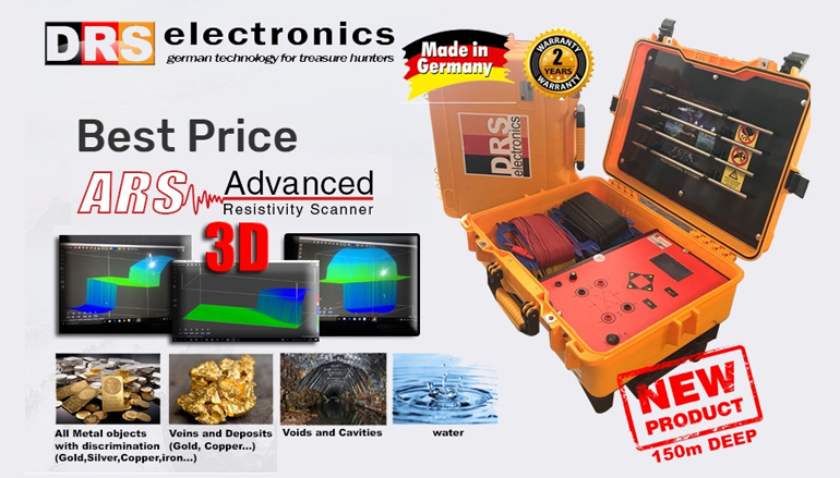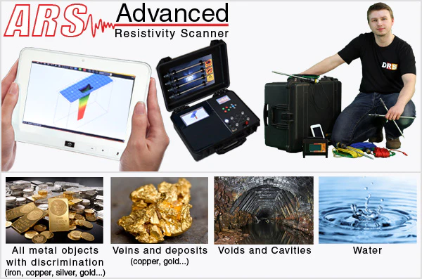 Advanced Resistivity Scanner (ARS) kami memungkinkan Anda mencari logam dengan diskriminasi (emas, tembaga, perak, besi), urat emas, mineral, gua/rongga, dan bahkan air. Hal ini dicapai melalui analisis resistivitas. Resistivitas adalah properti intrinsik yang mengukur seberapa kuat suatu material melawan aliran arus listrik. Teknik ini digunakan dalam konstruksi dan arkeologi. ARS akan mengirimkan arus listrik ke dalam tanah berkat 2 atau 4 probe untuk kedalaman hingga 200 meter! Kemudian akan menganalisa hasil pantulan sinyal tersebut selapis demi selapis. Ini akan menentukan komponen terpenting di bawah kaki Anda apakah itu air, kekosongan, mineral atau logam.